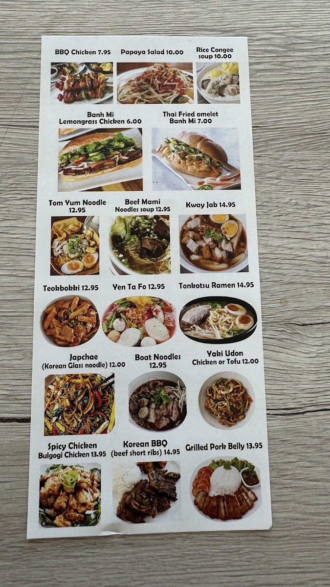 Their drink selection is just as varied, with options such as Vietnamese Coffee Frappe and Hello Kitty Ice Tea providing refreshing beverages to complement any dish. Moving to more substantial meals, the Banh Mi sandwiches are a must-try, featuring different fillings like Lemongrass Chicken and BBQ Pork Banh Mi. The noodle dishes include classic soups like Wonton Soup and the aromatic Tom Yum Noodle, while special dishes such as Teokbokki and Korean BBQ deliver bold flavors.