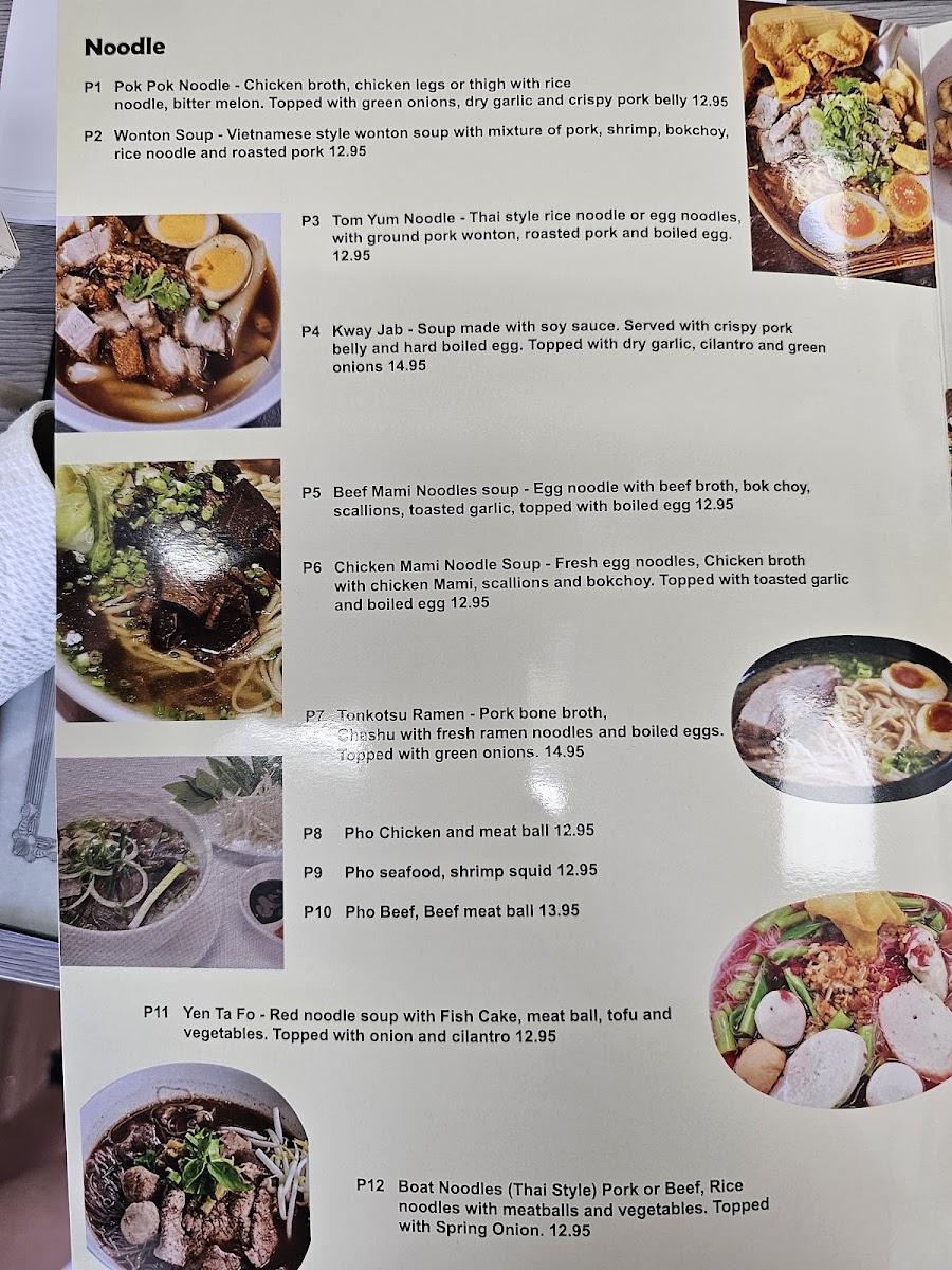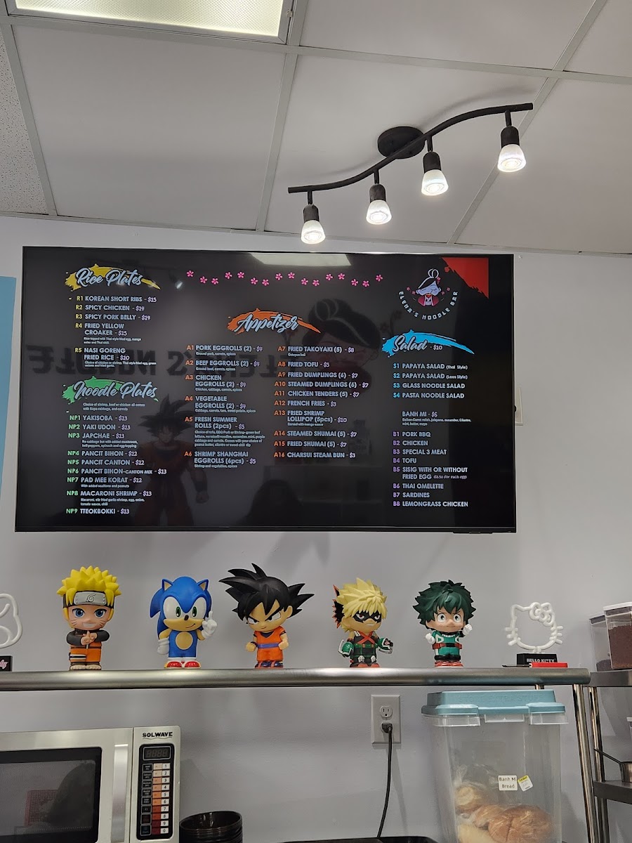 Elena's Noodle Bar offers a diverse and flavorful menu, blending various Asian cuisines to create an exciting dining experience. The Rice Plates section features savory options like Korean Short Ribs and Spicy Pork Belly, along with the Nasi Goreng Fried Rice, a deliciously spiced Indonesian classic. For those looking to start their meal with something crispy, the Appetizers menu includes favorites such as Pork Eggrolls and Chicken Eggrolls, as well as the refreshing Fresh Summer Rolls. The salads are equally enticing, offering options like Papaya Salad and Glass Noodle Salad, perfect for light, flavorful starters.